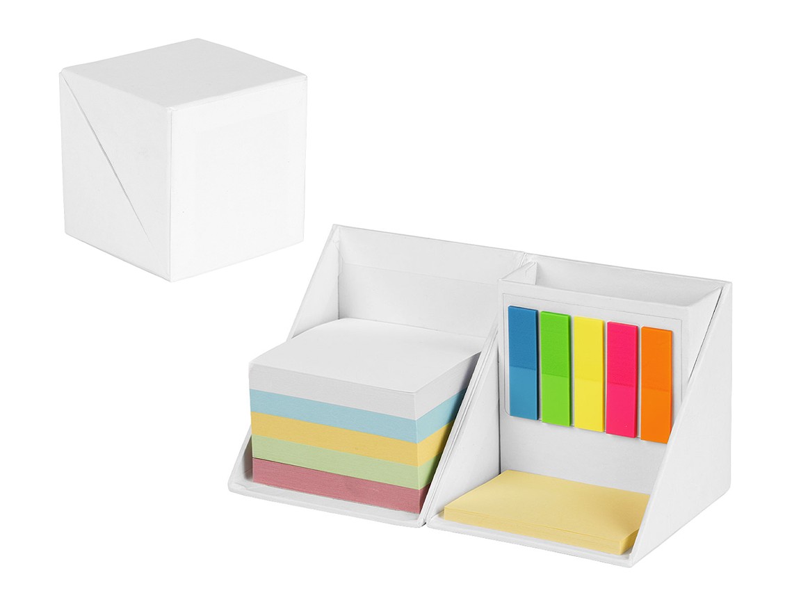 Биоразградлива коцка на расклопување со стикери во разни бои за обележување, ливчиња во повеќе бои за белешки и место за пенкала.