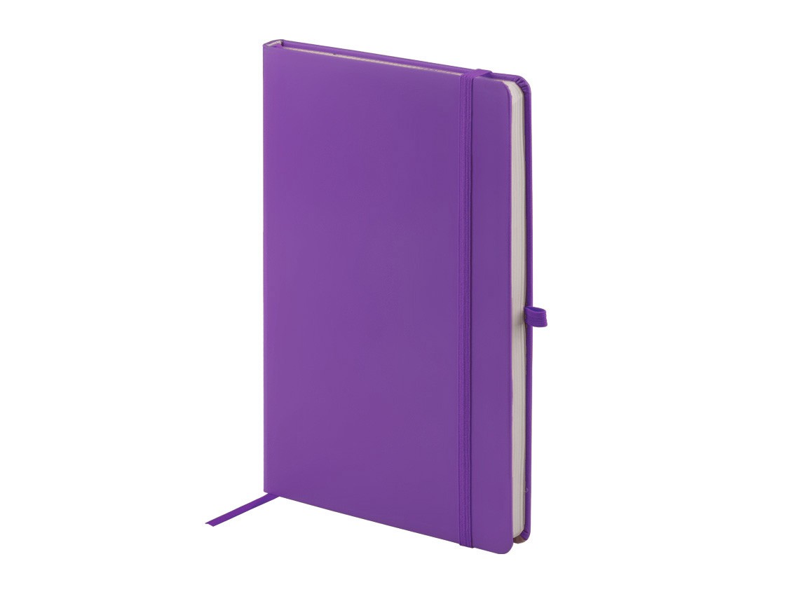 Нотес со еластична лента на корицата, внатрешна лента за обележување во боја како нотесот, држач за пенкало, заоблени агли. Kорицата e тврда од PU материјал, тенка еластична лента на корицата. Корицата е погодна за UV печатење во сите бои. Книжен блок: 80гр. хартија, 160 страни по линии предвидени за белешки. Димензија: 14.8 х 21 cm